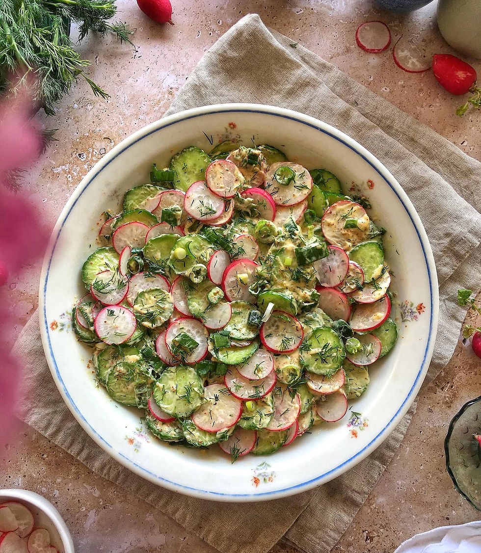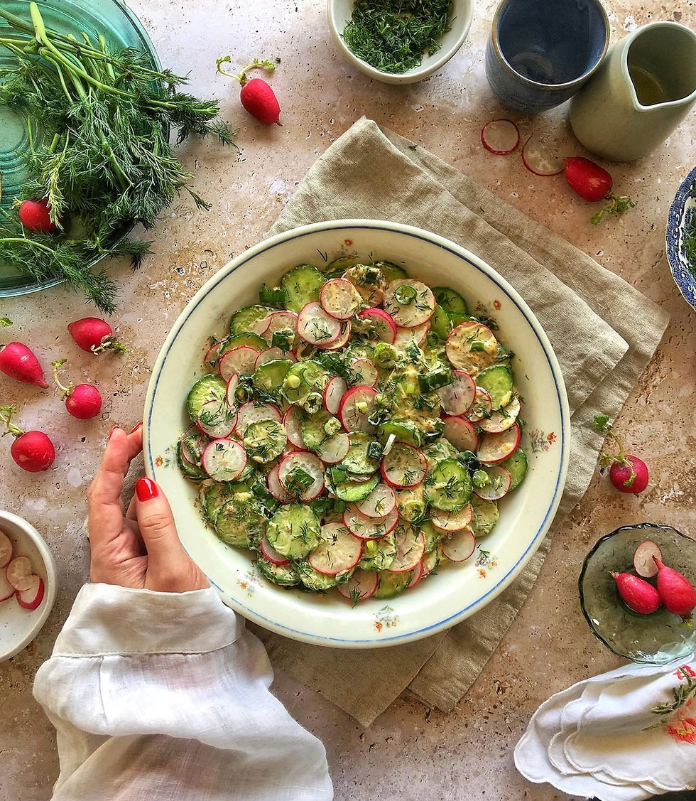 Τα φρέσκα τραγανά ραπανάκια και το αγγούρι, με τα φρέσκα κρεμμυδάκια, τον άνηθο και τη βινεγκρέτ με μουστάρδα δημιουργούν έναν απολαυστικό, δροσερό συνδυασμό που ταιριάζει ιδανικά με ψητά πουλερικά, ζουμερές μπριζόλες αλλά και φρέσκα ψάρια. Δροσερή, ορεκτική και πεντανόστιμη, είναι η σαλάτα που αξίζει μια θέση σε κάθε τραπέζι — από το καθημερινό γεύμα μέχρι το πασχαλινό τραπέζι!