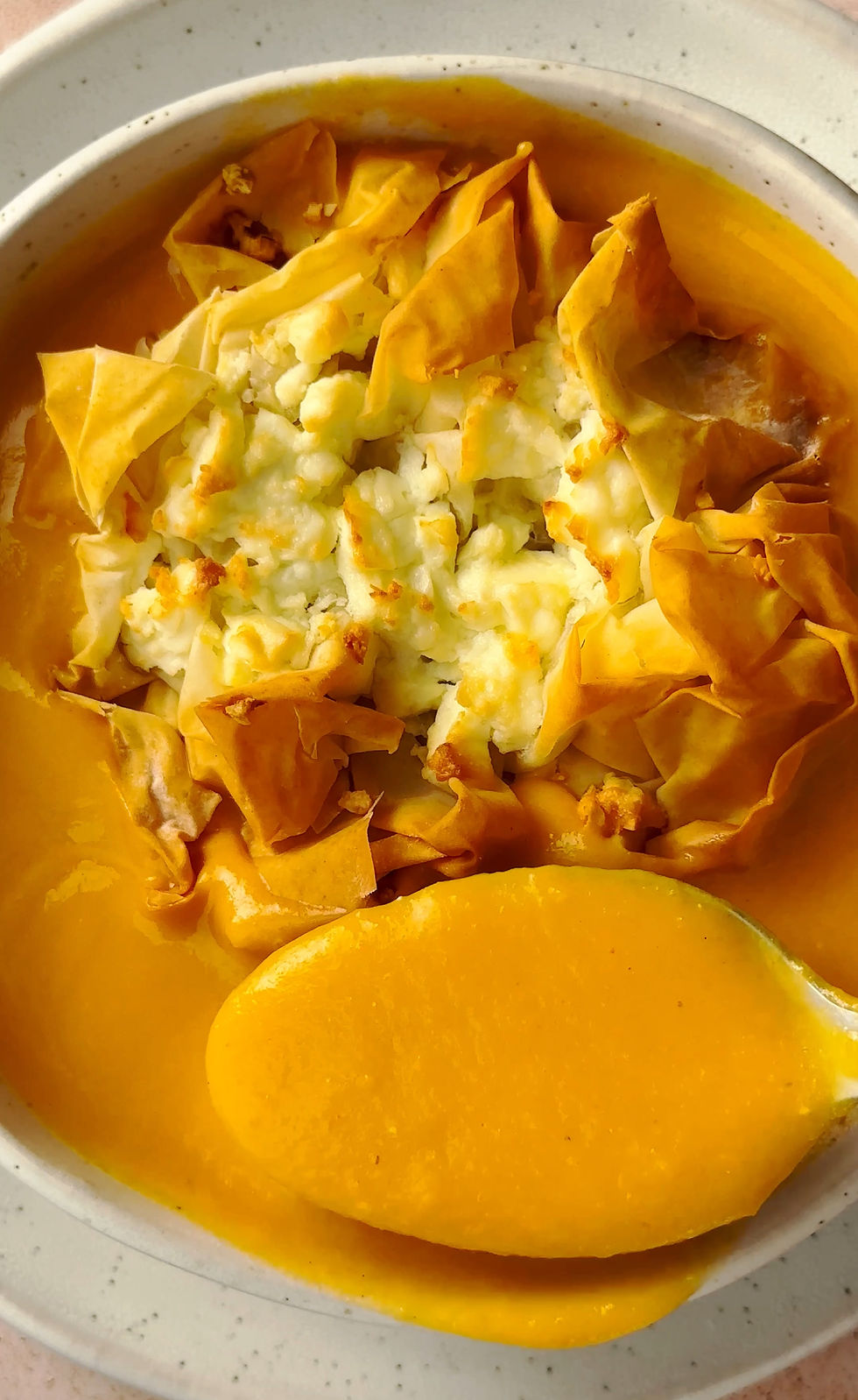 Πεντανόστιμη, βελούδινη σούπα γλυκοπατάτας με καρότα και ξινόμηλο, σερβιρισμένη με τραγανές μίνι τυρόπιτες αντί για κρουτόν! Ένα ζεστό, χειμωνιάτικο comfort γεύμα με απίστευτη νοστιμιά. Οι μίνι τυρόπιτες με φέτα και φύλλο κρούστας απογειώνουν τη σούπα και κάνουν κάθε κουταλιά… εμπειρία. Ιδανική για οικογενειακό τραπέζι ή ένα cosy βράδυ στο σπίτι.