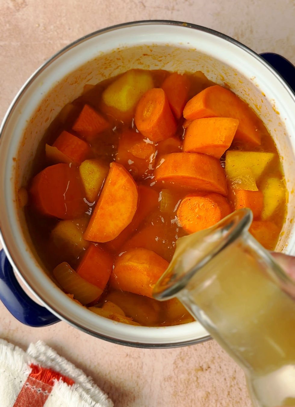 2 διαλύουμε ένα κύβο ζωμό κότας σε 800γρ. ζεστό νερό και το προσθέτουμε στην κατσαρόλα και ανακατεύουμε, χαμηλώνουμε τη φωτιά και αφήνουμε να βράσουν όλα μαζί μέχρι να μαλακώσουν τα καρότα και να δέσει λίγο η σούπα.